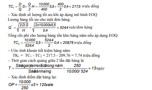 lập các ước lượng sau đây từ những thông tin kế toán: Nhu cầu D = 10.000 vale/năm; Q = 400 vale/đơn hàng (lượng đặt hàng hiện nay); chi phí tồn trữ H = 0,4 triệu đồng/vale/năm và chi phí đặt hàng S = 5,5 triệu đồng/đơn hàng; thời gian làm việc trong năm là 250 ngày; và thời gian chờ hàng về mất 3 ngày (kể từ khi đặt hàng đến khi nhận được hàng).