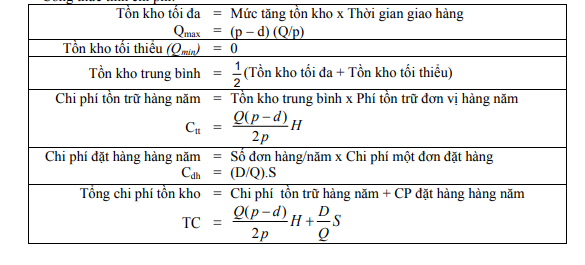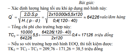 Ví dụ 7.3: Tiếp theo ví dụ 7.2, Công ty C có bộ phận sản xuất bên cạnh có thể sản xuất vale này tại chỗ theo lô sản xuất, họ muốn nhập kho một cách từ từ vào nhà kho chính để dùng. Số liệu được về mức sản xuất của công ty là p = 120 vale/ngày, nhu cầu tiêu thụ hàng ngày là d =
