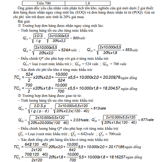 So sánh chi phí ở từng mức khấu trừ, ta thấy mức chi phí ở mức khấu trừ 3 là nhỏ nhất nên quyết định đặt mua hàng là 700 vale/đơn hàng.