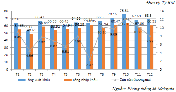 Các con số thống kê từ Đại học Michigan (Mỹ) cho thấy, so với thế giới, Malaysia đang đứng thứ 21/136 về xuất khẩu, 25/136 về nhập khẩu và 16/136 về cán cân thương mại. Số liệu cụ thể về tình hình xuất nhập khẩu được thể hiện trong biểu đồ sau: