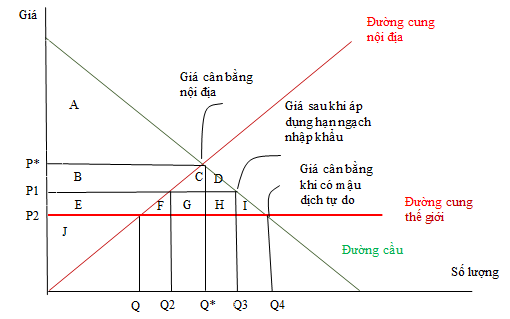 - Hạn ngạch tác động gián tiếp lên giá cả thông qua hạn chế nhập khẩu: Thực chất, hạn ngạch nhập khẩu là việc cắt giảm lượng hàng được nhập khẩu vào một quốc gia. Trong thị trường cạnh tranh, điểm cân bằng quyết định đến lượng và giá của hàng hoá, dịch vụ là điểm giao nhau giữa đường cầu và đường cung. Tại thị trường nội địa, điểm cân bằng sẽ là P* và Q*. Khi tồn tại thương mại quốc tế, điểm cân bằng này có thể thay đổi. Chẳng hạn, giá của một hàng hoá nằm dưới điểm P* khi nhập khẩu từ nước ngoài lớn hơn sản xuất trong nước. Đồng thời giả định rằng, nền kinh tế thế giới có thể cung cấp nhiều hàng hoá hơn tại mức giá đó. Khi đó, đường cung thế giới là một đường nằm ngang tại mức giá của hàng nhập khẩu P2. Mức giá cân bằng giảm xuống P2 và lượng cân bằng tăng từ Q* lên Q4. Các doanh nghiệp trong nước sẽ phải sản xuất ít hơn (Q1), trong khi phần còn lại (sự chênh lệch giữa Q1 và Q4) sẽ được chuyển sang nhà nhập khẩu.