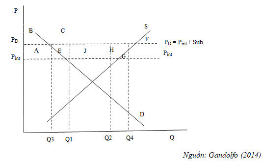 Trợ cấp xuất khẩu sẽ làm tăng giá cả trong nước từ Pint đến PD. Sự gia tăng này khiến thặng dư tiêu dùng giảm xuống một lượng bằng với diện tích ABCJ và thặng dư sản xuất gia tăng bằng với diện tích ABFH. Sự mất mát do giảm lượng tiêu dùng cho xã hội bằng với diện tích ECJ và HFG. Chi phí của trợ cấp là ECFG. Việc trợ cấp sẽ làm cho sản xuất gia tăng từ Q2 đến Q4 và lượng hàng hóa xuất khẩu gia tăng từ Q1Q2 đến Q3Q4. Như vậy, trợ cấp xuất khẩu sẽ làm giảm lượng hàng bán nội địa và làm tăng giá cả trong thị trường nội địa bằng với giá cả quốc tế cộng với khoản trợ cấp, làm tăng lượng sản xuất trong nước nhằm tăng lượng xuất khẩu hàng hóa.