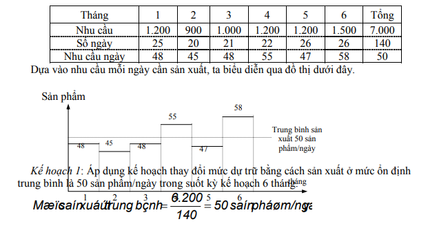 Căn cứ vào nhu cầu tiêu thụ sản phẩm và số ngày sản xuất của đơn vị, ta xác định được nhu cầu sản xuất bình quân mỗi ngày ở từng tháng như sau.