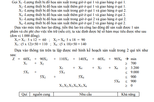 Phần xây dựng kế hoạch sản xuất này dựa trên cơ sở của môn “Mô hình toán kinh tế” (sinh viên tham khảo thêm chi tiết ở môn học này), chúng ta xây dựng được mô hình có dạng như dưới đây.