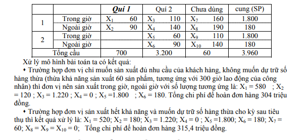 Một nhà lập lịch trình sản xuất phải xây dựng kế hoạch tổng hợp cho 2 quí của năm sau. Phân xưởng được tự động hóa cao, sản xuất thiết bị đồ họa cho thị trường máy vi tính. Công ty ước tính có 700 đơn vị sẽ cần vận chuyển đến khách hàng trong quí đầu tiên và 3.200 đơn vị trong quí thứ 2. Thời gian hao phí lao động cần thiết để sản xuất 1 đơn vị sản phẩm là 5 giờ và chỉ có sẵn 9.000 giờ lao động chính thức cho từng quí. Giờ làm thêm có thể dùng, nhưng công ty có chính sách giới hạn giờ làm thêm không quá 10% giờ lao động chính thức. Chi phí cho lao động trong giờ là 12.000 đồng/giờ, nếu làm thêm là 18.000 đồng/giờ; chi phí tồn trữ là 50.000 đồng/sản phẩm/quí. Hỏi có bao nhiên đơn vị được sản xuất trong giờ, ngoài giờ và tồn trữ ?