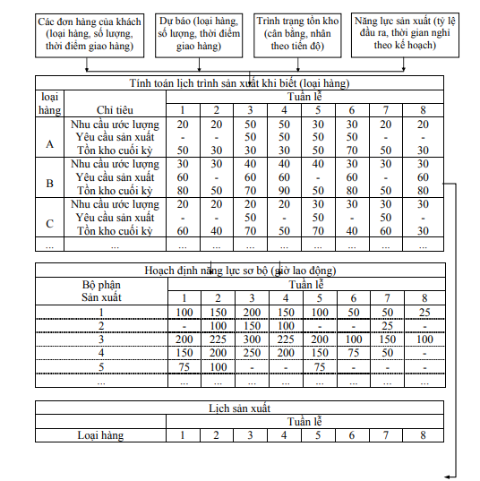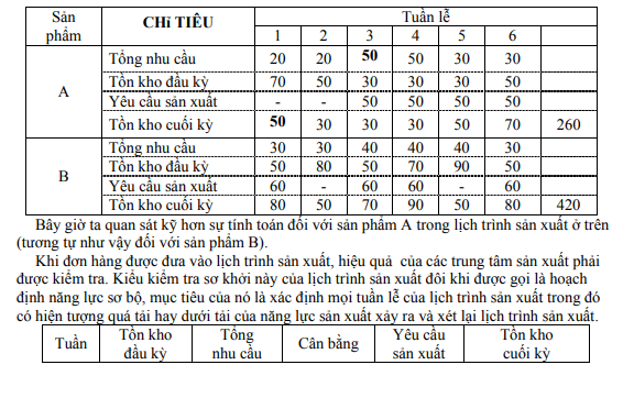 Lịch trình sản xuất theo năng lực sản xuất ngắn hạn và được xác định bởi kế hoạch tổng hợp và phân bố cho những đơn hàng mục tiêu của nó là: