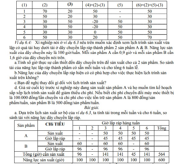 564 giờ, so với năng lực sản xuất của xí nghiệp thì đơn vị này đủ sức để thực hiện số lượng sản phẩm theo yêu cầu của khách hàng trong điều kiện bình thường. Tuy nhiên, nếu căn cứ vào thời điểm nhu cầu khách hàng cần mới tiến hành sản xuất thì lịch trình sản xuất phân bố không đều, cụ thể là quá tải sản xuất ở tuần 3, 4, 6 và dưới tải ở tuần 1, 2, 5. Do đó cần phải điều chỉnh lịch trình sản xuất cho hợp lý.