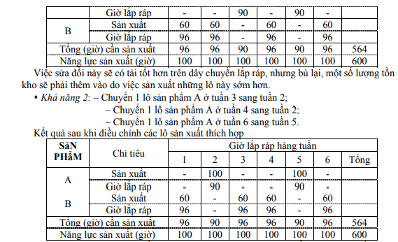 − Chuyển 1 lô sản phẩm B ở tuần 3 sang tuần 2. Kết quả sau khi điều chỉnh các lô sản xuất thích hợp