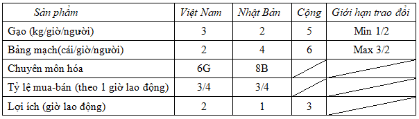 Việt Nam có lợi thế về sản xuất gạo, ngược lại Nhật Bản có lợi thế sản xuất bảng mạch. Người Việt Nam sẽ tập trung sản xuất gạo, còn người Nhật thì tập trung vào sản xuất bảng mạch. Sau đó hai bên sẽ trao đổi với nhau, tính theo số giờ lao động thì Việt Nam sẽ đổi 3 kg gạo (2G) lấy 4 bảng mạch (4B), tỷ lệ 3/4. Do đó Việt Nam sẽ có lợi vì chỉ có một giờ sản xuất nhưng có được 4M, thay vì sản xuất trong nước thì mất 2 giờ. Lợi ích của Việt Nam thu được từ trao đổi là 2 giờ lao động. Nhật cũng thu được lợi từ mua-bán là 1 giờ lao động.