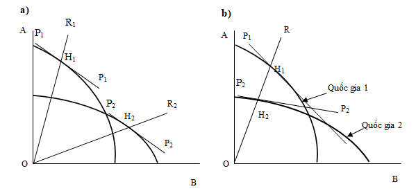 Chúng ta hãy xem xét tình trạng trước giao dịch (ví dụ: chính sách tự túc) và xem tỷ số hàng hóa – giá giống nhau ở cả 2 quốc gia (P1P1 và P2P2 song song, như vậy cho thấy tỷ số giá tương tự của PB/PA). Quốc gia 1 tại điểm H1 trên chính đường cong biến đổi của nó và quốc gia 2 tại điểm H2. Chúng ta thấy rằng, với giá tương đối của các sản phẩm giống nhau, tỷ số đầu vào của A so với B ở quốc gia 1 lớn hơn so với ở tại quốc gia 2, do độ dốc của OR1 lớn hơn độ dốc của OR2. Tính chất này đúng với bất kỳ giá sản phẩm tương đối phổ biến nào. Một cách tiếp cận khác dựa vào hình b, với một tình trạng trước giao dịch và xem xét một tỷ số A – B cho trước mà giống nhau ở cả 2 quốc gia thì được đại diện bởi độ dốc của OR. Quốc gia 1 sẽ nằm tại điểm H1 trên đường cong biến đổi của mình và quốc gia 2 tại điểm H2. Tỷ lệ biến đổi biên ở quốc gia 1 lớn hơn so với quốc gia 2 (được tính lần lượt tại H1 và H2). Khi đó, hàng hóa A sẽ tương đối rẻ hơn ở quốc gia 1 so với quốc gia 2, và ngược lại đối với hàng hóa B (cần lưu ý là ở trong trạng thái cân bằng, tỷ lệ biến đổi biên trùng với tỷ số hàng hóa – giá PB/PA). Nói cách khác, chi phí cơ hội của A theo B là thấp hơn ở quốc gia 1, quốc gia dư dả về vốn và có xu hướng sản xuất hàng hóa A sử dụng nhiều vốn hơn. Trong khi đó, quốc gia 2 dư dả nhiều lao động có xu hướng thích sản xuất hàng hóa B sử dụng nhiều lao động hơn với mong muốn là mỗi quốc gia có thể mở rộng sản xuất hàng hóa của mình trong việc tăng cường sử dụng mạnh mẽ yếu tố dư thừa của đất nước với một chi phí thấp hơn quốc gia khác.