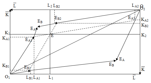 Để tìm bất kỳ sự phân chia nào đáp ứng các yêu cầu thì chúng ta bắt đầu bằng cách phân chia tùy ý cho mỗi quốc gia 1 phần của đầu ra cân bằng hợp nhất. Bằng cách thức này thì chuyên môn hóa không hoàn toàn sẽ được đảm bảo. Hãy để SA1, SB1, SA2 = 1 – SA1, và SB2 = 1 – SB2 là những phần được lựa chọn tùy ý. Bước tiếp theo là tìm vector việc làm theo lĩnh vực cho mỗi quốc gia được biểu thị bởi EA1 và EB1, EA2 và EB2. Chúng phải có độ dốc giống nhau như các vector việc làm theo lĩnh vực của sự cân bằng hợp nhất (do chúng ta yêu cầu giá các yếu tố giống nhau) và chiều dài của chúng phải tương ứng với đầu vào các yếu tố đưa đến các đầu ra, tương đương A*1 = SA1A*W, B*1 = SB1B*W, A*2 = (1 – SA1)A*W, B*2 = (1- SB1)B*W. Dựa vào những yêu cầu này, vector việc làm của mỗi quốc gia là 1 phần nhỏ của các vector việc làm cân bằng hợp nhất, một cách chính xác EA1 = SA1EA, EB1 = SB1EA, EA2 = (1 – SA1)EA, EB2 = (1 – SB1)EB. Để cho O1 là gốc của các đơn vị đo lường cho quốc gia 1 và O2 là gốc của các đơn vị đo lường của quốc gia 2 trong nền kinh tế thế giới 2 quốc gia. Những vector này như là những đoạn nhỏ của các vector việc làm theo lĩnh vực của thế giới. Tổng của O1EA1 và O1EB1 đưa đến vector O1E là đại diện cho tổng việc làm ở quốc gia 1. Do việc làm đầy đủ, vector này tất yếu đại diện cho vector tài sản của quốc gia 1, phù hợp với những phần được lựa chọn tùy ý. Tương tự, O2E đại diện cho vector tài sản kết quả của quốc gia 2. Các vector O1E và O2E có các tính chất mà chúng ta yêu cầu. Chúng đại diện cho một sự phân phối tài sản thế giới, sự cân bằng thương mại thế giới đạt được giá yếu tố tương tự như là sự cân bằng hợp nhất và mỗi quốc gia như vậy được chuyên môn hóa không hoàn toàn. Nhóm của tất cả những sự phân bổ có khả năng như vậy được lý giải như là tổng của các tất cả các phân đoạn nhỏ có khả năng của các vector việc làm thế giới. Chính vì vậy được mô tả bằng đồ thị bởi khu vực được phân ranh giới bởi hình bình hành gồm 4 vector O1EA, O2EB, O2EA, O1EB. Bất kỳ điểm nào nằm bên trong hình bình hành đại diện một sự phân chia của nền kinh tế thế giới hợp nhất như giá yếu tố trở nên bằng nhau và các quốc gia được chuyên môn hóa không hoàn toàn. Đường biên của hình bình hành thuộc về nhóm FPE và hàm ý ít nhất một quốc gia được chuyên môn hóa hoàn toàn.