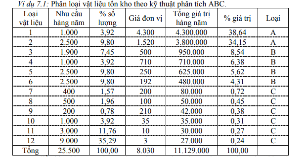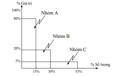 − Nhóm C: Gồm những loại hàng có giá trị thấp, giá trị dự trữ chỉ chiếm khoảng 5% so với tổng giá trị hàng dự trữ, nhưng số lượng chiếm khoảng 50−55% tổng số lượng hàng dự trữ.