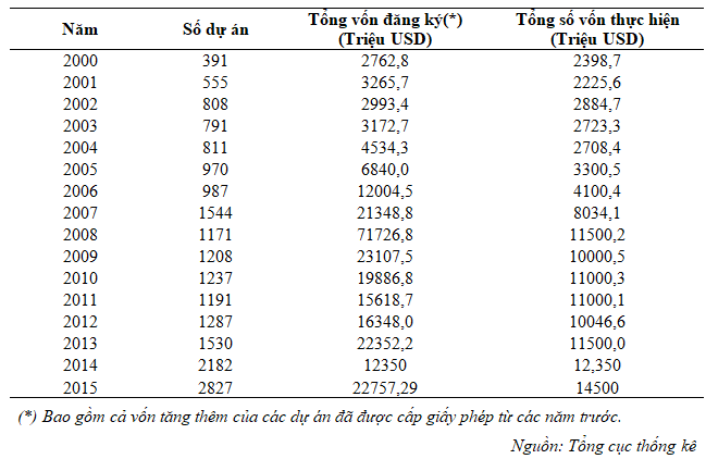Bảng 9.1: Tình hình đầu tư nước ngoài vào Việt Nam giai đoạn 2000 – 2015