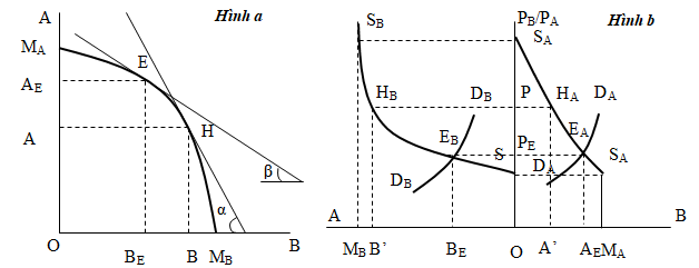 Tương tự như vậy, giao điểm của đường cong SBSB với trục tung tại một điểm mà tỷ số giá tạo nên điểm tối ưu trên đường cong chuyển đổi và trùng với điểm MA (hình 3.7a). Tại điểm này, sản lượng của hàng hóa B bằng 0 tương ứng với sản lượng của hàng hóa A đạt cực đại, như trên đồ thị được thể hiện bởi độ dài OMA.