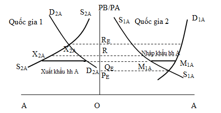 Khi điều khoản thương mại là OR, tại quốc gia 1 mức dư cầu hàng hóa A (và mức dư cung hàng hóa B) giảm dẫn đến mức dư cung hàng hóa A (và mức dư cầu hàng hóa B) tại quốc gia 2. Dễ dàng nhận thấy rằng mức dư cầu hàng hóa A tại quốc gia 1 lớn hơn mức dư cung hàng hóa này tại quốc gia 2 dẫn đến mức dư cầu hàng hóa A (và dư cung hàng hóa B) trên thị trường thế giới. Quá trình này tiếp tục diễn ra cho đến khi đạt được điểm QE (mức dư cầu hàng hóa A tại quốc gia 1 chính xác bằng mức dư cung hàng hóa này tại quốc gia 2). Trên thị trường quốc tế đối với sản phẩm A, sự cân bằng cung cầu tại sản lượng giao dịch OQE (thị trường quốc tế đối với hàng hóa B cũng cân bằng). Quốc gia 1 sẽ nhập khẩu một lượng M1AM1A hàng hóa A, chính xác bằng lượng X2AX2A hàng hóa này quốc gia 2 xuất khẩu. Tương tự như vậy (nhưng ngược lại) đối với việc quốc gia 1 xuất khẩu và quốc gia 2 nhập khẩu hàng hóa B.
