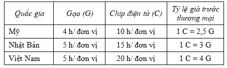 - Trường hợp 2 (1C : > 3 G): tức là đổi 1 C lấy nhiều hơn 3 G, ví dụ: 1 C: 4 G. Lúc này, Nhật Bản sẽ có lợi khi thực hiện trao đổi bởi tỷ lệ trao đổi quốc tế (1 C: 4 G) khác với tỷ lệ trao đổi trong nước (1 C = 3 G). Nhật Bản sẽ có lợi khi xuất khẩu chip điện tử (C) và nhập khẩu gạo (G). Nhật Bản sẽ đổi được 1C lấy 4G trong khi trong nước 1 C chỉ đổi được 3 G. Mô hình trao đổi trên thế giới lúc này sẽ là Nhật Bản và Mỹ xuất khẩu chip điện tử (C) và nhập khẩu gạo (G) từ Việt Nam.