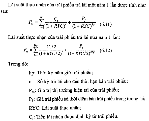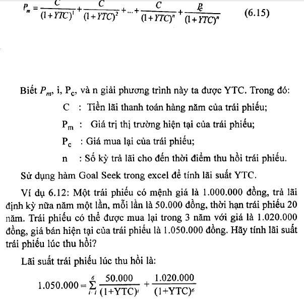 Ví dụ 6.9: Nhà đầu tư mua trái phiếu của công ty A có mệnh giá 10.000 đồng có thời hạn 10 năm được hưởng tiền lãi 6 tháng 1 lần, mỗi lần 50.000 đồng. Giả sử trái phiếu có thể được bán lại sau 2 năm với giá là 1.100.000 đồng, giá bán hiện tại cùa trái phiếu là 1.050.000 đồng. Hãy tính lãi suất thực nhận của trái phiếu này nếu nhà đầu tư bán lại trái phiếu sau 2 năm?