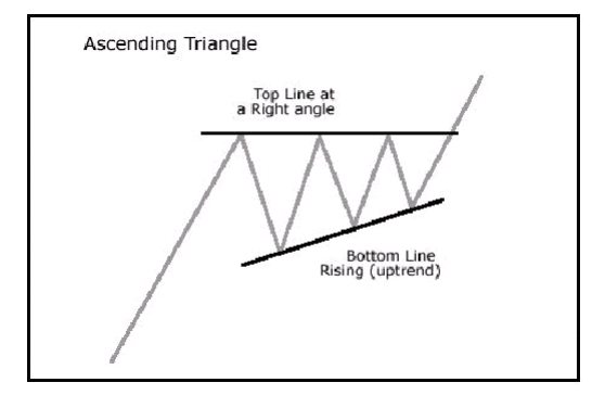 Thường thì mô hình này cần ít hơn ba tháng để hoàn thiện và khi xuất hiện thường kèm theo sự gia tăng của khối lượng giao dịch. Với mô hình này ta có thể nhận thấy sự hội tụ của hai đường kháng cự và hỗ trợ thể hiện bằng sự thu hẹp khoảng cách giữa các đỉnh và các đáy của thị trường, kéo dài hai đường kháng cự và hỗ trợ chúng sẽ cắt nhau ở đỉnh tam giác ở phía phải đồ thị. Đường kháng cự nằm ngang và đường hỗ trợ hướng lên cho thấy các mức giá cao có xu thế giữ nguyên còn các mức giá thấp nhất lại có xu thế tăng dần lên, điều này cũng có nghĩa là người mua có động cơ mạnh hơn người bán.