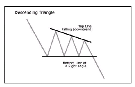 Mô hình tam giác thường xuất hiện trong thị trường xuống giá và cũng mang tính củng cố (hay duy trì) xu thế hiện tại. Thời gian tồn tại của mô hình này là khoảng 1 đến 3 tháng. Hai đường kháng cự và hỗ trợ có xu hướng hội tụ, đường kháng cự hướng xuống còn đường hỗ trợ nằm ngang.