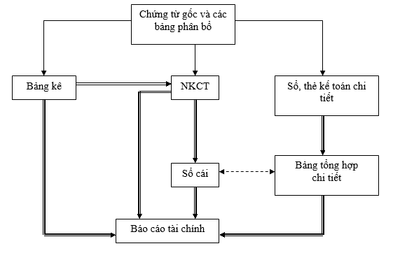 Cuối tháng đối chiếu số liệu giữa bảng tổng hợp chi tiết với sổ cái. Căn cứ sổ cái, bảng tổng hợp chi tiết, bảng kê và nhật kí chứng từ lập báo cáo tài chính.