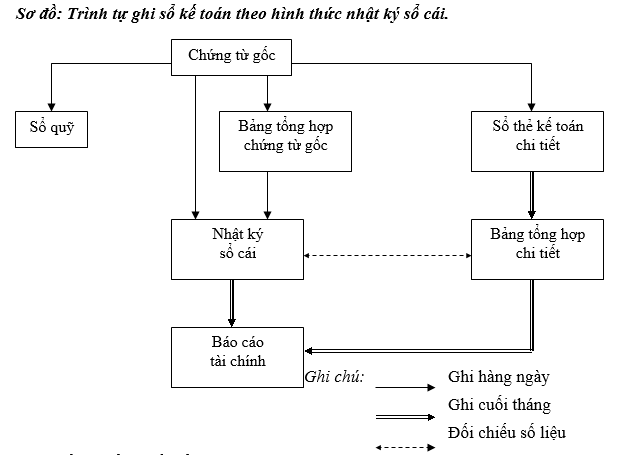 Trình tự ghi sổ theo hình thức nhật kí – sổ cái: hàng ngày khi có nghiệp vụ kinh tế phát sinh, căn cứ vào chứng từ kế toán đã được lập để ghi vào sổ nhật kí-sổ cái, sau đó ghi vào sổ kế toán chi tiết. Cuối kì tổng hợp số liệu của các tài khoản trên sổ nhật kí-sổ cái và bảng tổng hợp chi tiết để lập các báo cáo tài chính.