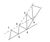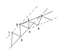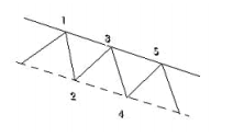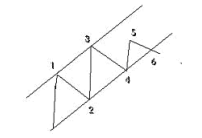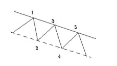 Nếu giá không đạt được đến đường kênh và chuyển động phá vỡ đường xu thế thì điều này chỉ ra rằng xu thế thị trường đổi ch iều thành xu thế giá giảm. Hai đỉnh mới xuất hiện (đỉnh 5 và 7) sẽ là cơ sở để vẽ đường xu thế giá giảm, tương tự ta sẽ vẽ đường kênh song song đường xu thế và đi qua đáy 4. Chú ý là ở đây có sự đổi vai trò đường xu thế ban đầu trở thành đường kênh và ngược lại.