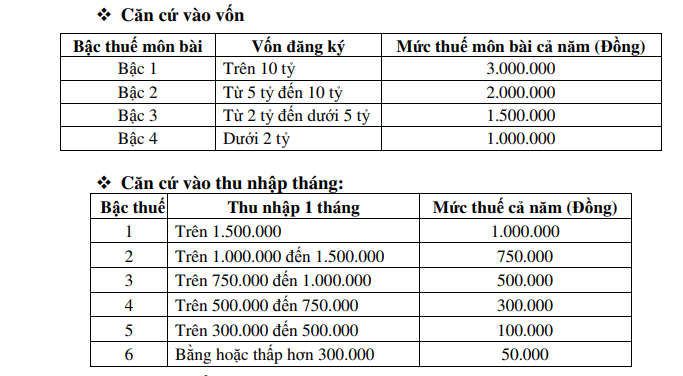 - Tính thuế môn bài theo thu nhập bình quân tháng được áp dụng cho hô kinh doanh và cá nhân kinh doanh (không có vốn đăng ký).