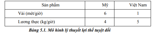 Nếu theo quy luật lợi thế tuyệt đối (so sánh cùng 1 sản phẩm về năng suất lao động ở 2 quốc gia Mỹ và VN) thì Mỹ có năng suất lao động cao hon về sản xuất vải so với Việt Nam và nguợc lại Việt Nam có năng suất lao động cao hon về sản xuất luong thực so với Mỹ. Do đó, Mỹ sẽ tập trung sản xuất vải để đem trao đổi lấy luong thực của Việt Nam (xuất khẩu vải và nhập khẩu luong thực). Còn Việt Nam sẽ tập trung sản xuất luong thực và xuất khẩu để nhập khẩu vải.