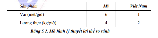 Giả sử 1 giờ lao động ở Mỹ sản xuất được 6 mét vải, 1 giờ lao động ở Việt Nam chỉ sản xuất được 1 mét vải. Trong khi đó 1 giờ lao động ở Mỹ thì chỉ sản xuất được 4 kg lương thực, còn ở Việt Nam thì sản xuất được 5kg lương thực. Các số liệu được biểu thị như sau: