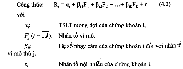 Các hệ số F trong công thức trên đại diện cho các nhân tố vĩ mô nhu: tình trạng ngoài dự kiến của tăng trưởng kinh tế, lạm phát, sự biến động ngoài dự kiến của giá cả chứng khoán, giá dầu, lãi suất,… Tóm lại, một nhân tố vĩ mô là một biến số kinh tế có tác động cụ thể đối với TSLT của đa sổ chứng khoán chứ không phải chi tác động đến một vài chứng khoán riêng lẻ.