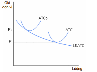 Nếu tồn tại độc quyền do qui mô kinh tế thì doanh nghiệp có qui mô lớn có thể sản xuất với mức chi phí thấp hơn các doanh nghiệp có qui mô nhỏ. Biểu đồ dưới đây minh họa điều này. Khi một ngành mới phát triển sẽ có nhiều doanh nghiệp nhỏ tồn tại. Chẳng hạn, giả sử các doanh nghiệp đều có chi phí trung bình là “ATCo”. Nếu một doanh nghiệp có qui mô lớn hơn các doanh nghiệp khác, thì doanh nghiệp đó sẽ có chi phí trên mỗi đơn vị sản xuất thấp hơn các doanh nghiệp khác (như minh họa của đường ATC’). Điều này cho phép doanh nghiệp cung cấp sản lượng với mức giá thấp hơn (P’ chẳng hạn). Với mức giá này thì các doanh nghiệp qui mô nhỏ sẽ bị thua lỗ (lưu ý rằng các doanh nghiệp nhỏ sẽ có lợi nhuận kinh tế bằng không tại mức giá Po, nhưng tại mức giá P’ thì doanh nghiệp nhỏ bị lỗ và doanh nghiệp lớn sẽ có lợi nhuận kinh tế).