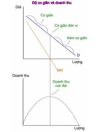Mối quan hệ này được minh họa trong biểu đồ dưới đây. Như biểu đồ cho thấy, tổng doanh thu sẽ tối đa tại mức sản lượng mà ở đó cầu là co giãn đơn vị (và MR = 0). Giả định rằng doanh nghiệp mong muốn tối đa hóa doanh thu, thì đây là mức sản lượng sản xuất tốt nhất cho doanh nghiệp. Trong khi đó, doanh nghiệp muốn tối đa hóa lợi nhuận thì cần phải xem xét cả doanh thu và chi phí và mức sản lượng trong trường hợp này được xác định tại MR= MC.