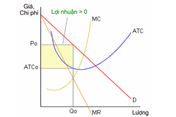 Với doanh nghiệp độc quyền được minh họa trong biểu đồ trên, MR = MC tại mức sản lượng Qo. Khi đó, mức giá bán tương ứng là Po. Từ khi mức giá (Po) lớn hơn chi phí trung bình (ATCo) tại mức sản lượng này, doanh nghiệp sẽ nhận được lợi nhuận kinh tế. Lợi nhuận của doanh nghiệp độc quyền này khác với lợi nhuận mà doanh nghiệp cạnh tranh hoàn hảo nhận được do có rào cản thâm nhập ngành đối với thị trường độc quyền.