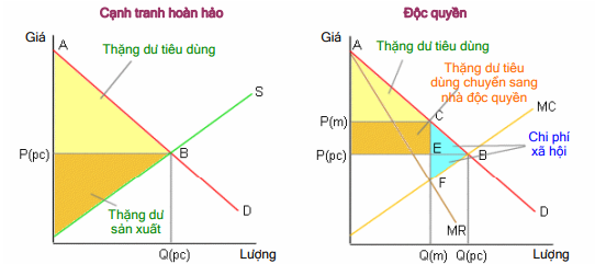 Phần phía trái của biểu đồ dưới đây minh họa thặng dư sản xuất và thặng dư tiêu dùng trong thị tường cạnh tranh hoàn hảo. Phần phía phải của biểu đồ minh họa phần mất mát của thặng dư sản xuất và thặng dư tiêu dùng do độc quyền. Như biểu đồ cho thấy, doanh nghiệp độc quyền nâng mức giá từ Ppc lên Pm trong khi lượng giảm từ Qpc xuống còn Qm. Mức giá cao hơn và lượng ít hơn trong độc quyền làm cho thặng dư tiêu dùng giảm tương ứng với diện tích PmCBPpc. Trong đó, một phần thặng dư tiêu dùng chuyển sang thặng dư sản xuất, tương ứng với diện tích PmCEPpc. Khi so sánh hiệu quả của độc quyền và cạnh tranh hoàn hảo trong dài hạn, ta thấy xã hội chịu một phí tổn ròng, được gọi là chi phí xã hội do độc quyền tương ứng với diện tích CBF, gồm phần mất mát thặng dư tiêu dùng (CBE) và thặng dư sản xuất (EBF).