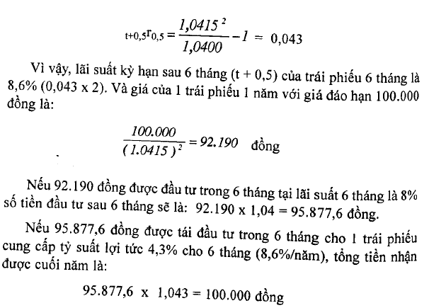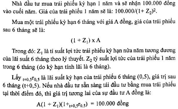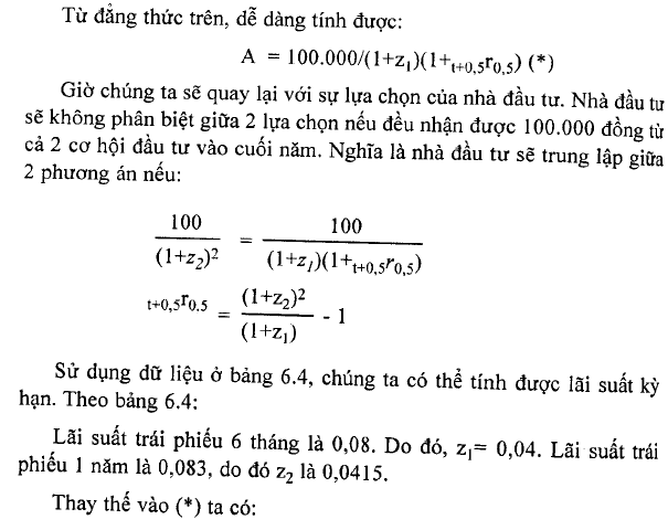 Nhà đầu tư sẽ trung lập giữa hai lựa chọn nểu hai cách đầu tư (cùng thời hạn một năm) đem lại mức lợi tức như nhau. Lãi suất của trái phiếu 6 tháng thứ nhất và lãi suất trái phiếu một năm đã biết. Tuy nhiên, chúng ta không biết tỷ suất lợi tức của trái phiếu thứ 2.