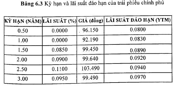 Bảng 6.3 trình bày kỳ hạn và lãi suất đáo hạn cho cho 6 loại trái phiếu kho bạc được sử dụng để tính toán lãi suất giao ngay.
