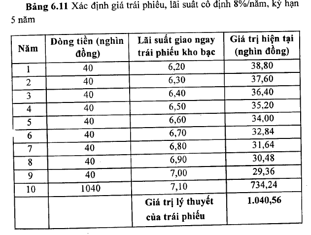 Ví dụ 6.28: Trái phiếu công ty cỏ lãi suất cố định 8%/năm, thời hạn đáo hạn của trái phiếu là 5 năm. Sừ dụng lãi suất giao ngay để chiết khấu các dòng tiền của trái phiếu, hãy tính giá trái phiếu này?