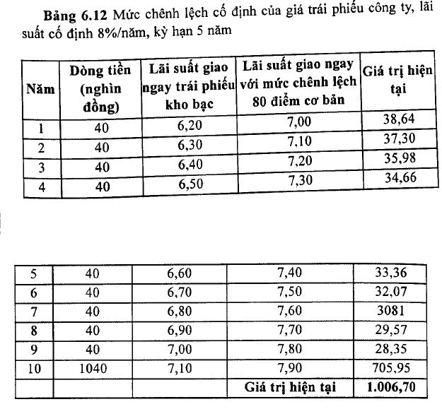 Mệnh giá cùa trái phiếu là 1.000.000 đồng, lãi được trà 2 lần 1 năm. Mức chênh lệch cố định là mức chênh lệch giữa giá trị hiện tại của dòng tiền từ thị giá của ừái phiếu công ty. Lãi suất giao ngay của trái phiếu kho bạc tăng thêm 80 điểm cơ bản làm cho giá trái phiếu tăng lên đến 1.006.700 đồng.