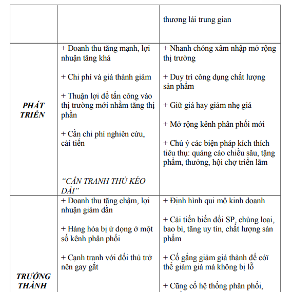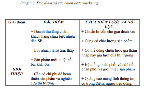 Đặc điểm và các chiến lược marketing tương ứng với từng giai đoạn của chu kỳ sống sản phẩm được tóm tắt trong bảng 3.3