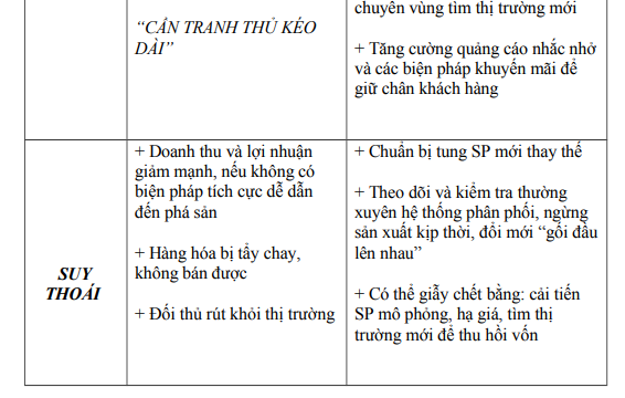 – Giai đoạn 4: Suy thoái, mức tiêu thụ giảm nhanh, lợi nhuận giảm.