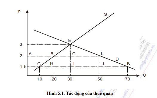 Bây giờ giả sử quốc gia Y đánh thuế 100% (thuế quan tính theo giá trị) trên sản phẩm X, giá cả sản phẩm X sẽ tăng lên 2 USD. Do mức giá cao hơn trước (gấp đôi), tiêu dùng sẽ giảm đi so với thương mại tự do, tức là còn 50 đơn vị sản phẩm X (đoạn AL), trong đó 20 đơn vị sản phẩm X được sản xuất trong nước (đoạn AB) và phần còn lại 30 đơn vị sản phẩm X (đoạn BL) được nhập khẩu từ bên ngoài. Như vậy, rõ ràng khi có thuế quan tiêu dùng giảm đi, nhưng sản xuất trong nước tăng lên, chính phủ lại thu được thuế.