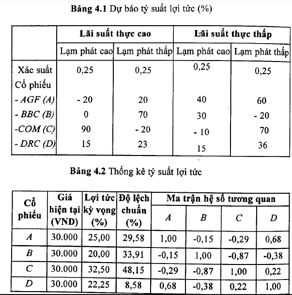 Từ trường hợp đơn giàn nhất khi luật một giá bị vi phạm, chúng ta tiếp tục thảo luận những cơ hội Arbitrage ít rõ ràng hơn. Giả định răng cố 4 cổ phiếu được mua bán với 4 tình huống khác nhau. Tỷ suat lợi tức nhện được của 4 chứng khoán đổi với mỗi tình huống lạm phát – lãi suất dược trình bày ở Bảng 4.1. Giá thực thế của chứng khoán và tỷ suất lợi tửc được thống kê ở Bảng 4.2.
