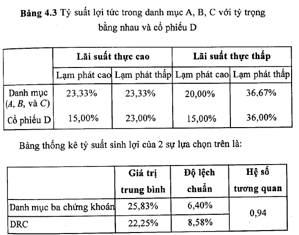 Tuy nhiên, xem xét một danh mục đầu tư với tỷ trọng bằng nhau cùa ba chứng khoán đầu tiên (AGF, BBC và COM), với tỷ suất lợi tức trong tương lai của chứng khoán thứ 4, DRC. Các tỷ suất lợi tức được trình bày qua Bảng 4.1 và được tóm tắt trong Bảng 4.3, cho thấy rằng danh mục đầu tư với tỷ trọng các chứng khoán bằng nhau sẽ hoạt động tốt hơn cổ phiếu DRC trong tất cả các tinh huống.