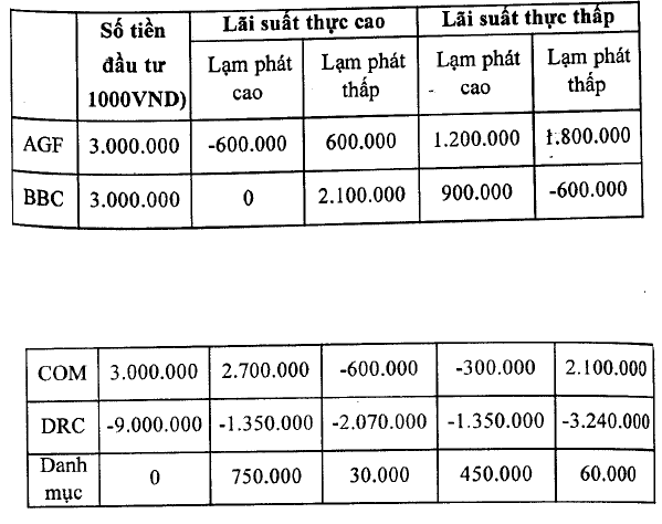 Bởi vì đây là hai loại tài sản khác nhau, ở đây không có sự vi phạm luật một giá. Tuy nhiên, danh mục với tỷ trọng các cổ phiếu bằng nhau này sẽ trở nên tốt hơn dưới bất kỳ trường hợp nào. Vì vậy, bất cứ các nhà đầu tư, ngại rủi ro hay không ngại rủi ro, vẫn có thế tận dụng cơ hội này. Nhà đầu tư sẽ bán cổ phiếu DRC và dùng doanh thu đó để mua danh mục đầu tư ở ưên. Giả sử chúng ta bán 300.000 cổ phiếu DRC và dùng 9 tỷ đồng doanh thu để mua tổng cộng 100.000 cổ phiếu của AGF, BBC và COM, lợi nhuận thu được từ hoạt động trên là: