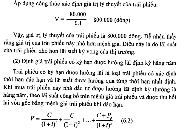 Ví dụ 6.1: Công ty A phát hành trái phiếu không kỳ hạn có mệnh giá 1 triệu đồng được hưởng lãi suất 8%/năm và tỷ suất lợi tức yêu cầu cùa thị trường đối với trái phiếu là 10%/năm. Hãy tính giá trị lý thuyết của trái phiếu này?