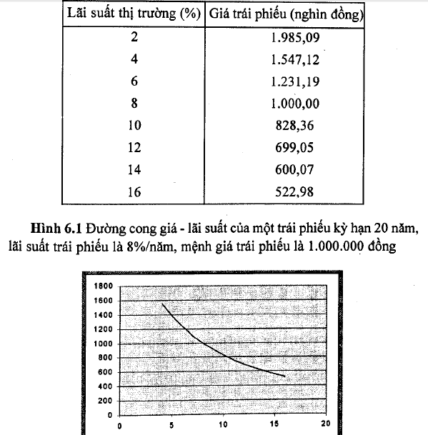 Bảng 6.1 Mối quan hệ giá – lai suất của một trái phiếu kỳ hạn 20 năm, lãi suất 8%/năm, mệnh giá trái phiếu 1.000.000 đồng