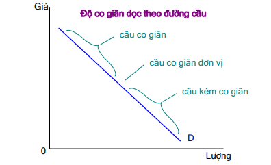 Nói chung, chúng ta nhận thấy độ co giãn của cầu giảm dần dọc theo đường cầu. Phần phía trên của đường cầu sẽ co giãn và độ co giãn sẽ giảm dần dọc từ trên xuống phía dưới của đường cầu. Tại một điểm nào đó trên đường cầu, cầu sẽ thay đổi từ co giãn sang kém co giãn. Dĩ nhiên, nếu tồn tại điểm như vậy thị cầu sẽ co giãn đơn vị tại điểm đó. Mối quan hệ này có thể minh họa bằng biểu đồ dưới đây.