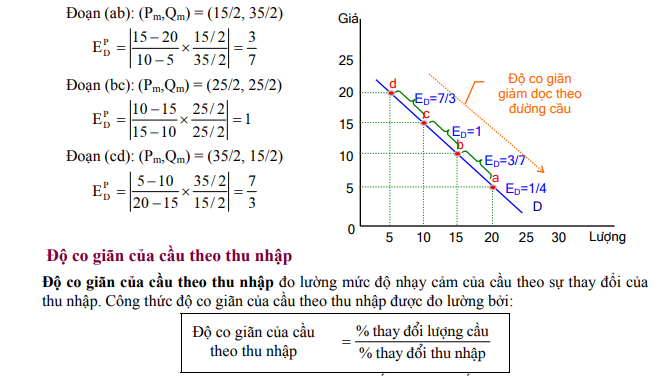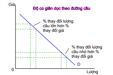 Hãy xem xét sự thay đổi giá và lượng cầu theo như minh họa dưới đây. Ở phần trên của đường cầu, phần trăm thay đổi về lượng là rất lớn (do lượng so sánh với gốc là rất nhỏ). Trong khi đó, phần trăm thay đổi giá là rất nhỏ (do giá so sánh với gốc là rất lớn). Vì vậy, cầu sẽ co giãn ở phần phía trên của đường cầu. Ở phần phía dưới của đường cầu, phần trăm thay đổi là rất lớn mặc dầu với cùng mức thay đổi lượng cầu (do mức giá là rất thấp). Vì vậy, cầu sẽ kém co giãn ở phần phía dưới của đường cầu.