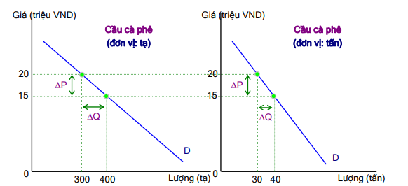 Biểu đồ dưới đây minh họa đường cầu cà phê trong thành phố khi sử dụng đơn vị đo lường khác nhau. Dĩ nhiên, đơn vị giá cả (triệu đồng) không đổi. Nếu sử dụng đơn vị đo lường sản lượng khác nhau (tạ và tấn) thì đo lường ΔQ/ΔP sẽ cho các giá trị khác nhau. Đường cầu sử dụng đơn vị tạ cà phê sẽ nông hơn và đo lường ΔQ/ΔP sẽ lớn hơn so với đường cầu sử dụng đơn vị tấn cà phê.