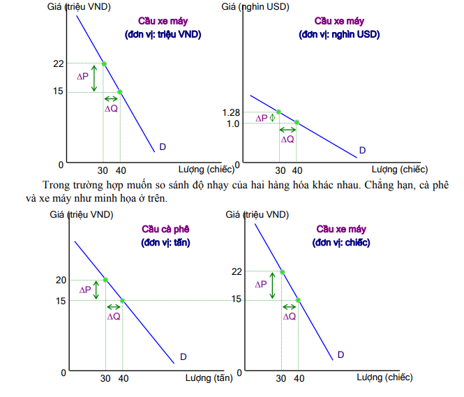 Một trường hợp khác minh họa đường cầu xe máy khi sử dụng đơn vị tiền tệ khác nhau (chẳng hạn, triệu VND và nghìn USD) như minh họa dưới đây. Khi đó, đơn vị tiền tệ có tỷ giá thấp hơn (trong trường hợp này là triệu VND, bởi vì 1 nghìn USD tương đương với 15 triệu VND) sẽ có đường cầu dốc hơn và đo lường ΔQ/ΔP nhỏ hơn so với đơn vị tiền tệ có tỷ giá cao hơn.